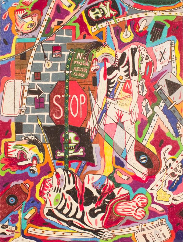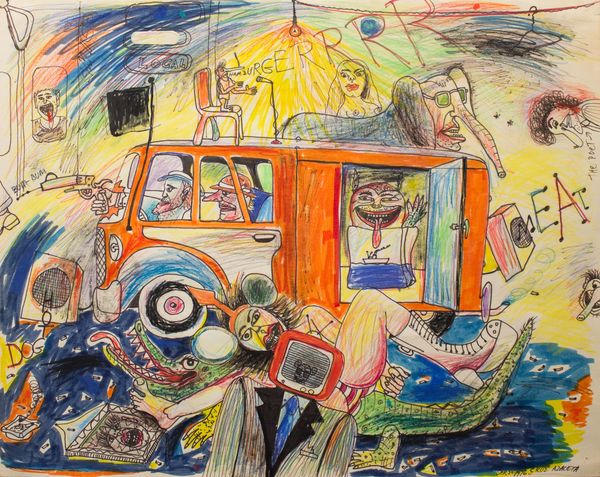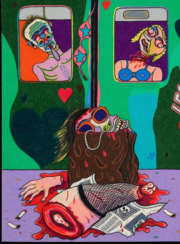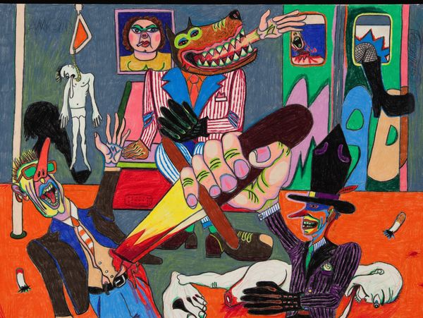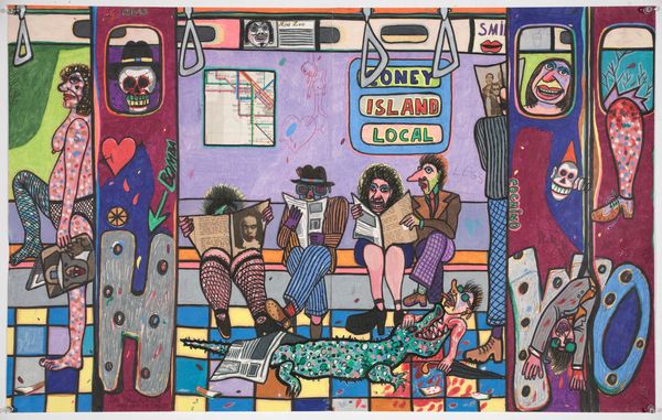 He went on to debut in New Talent at Allan Frumkin Gallery in 1975 with his “Subway Series.” The works were based on the New York City subway, its passengers, drama and graffiti. Azaceta depicted mankind as animal-like creatures with no trace of positive human qualities – made bestial only by an unsympathetic environment. The bright colors almost distract the viewer enough to overlook the dismembered limbs in a hotdog box in Ji Ji Ji Express (1974-75) or a crocodile devouring a human figure in Coney Island Local (1975). The works in the series are a tragi-comic outcry at man's condition.